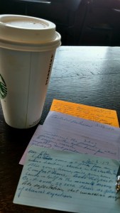 Timothy Greek is a long-time close friend of ours (he and my husband have been friends since their high school years participating in theatre performances), who has had the same writing practice throughout his lifetime. A poet, now in his sixties, he has always carried around several 3 x 5 cards on which he jots down the lines to poems as he thinks of them. I recall him in his twenties, usually carrying a science fiction novel that had 3 x 5 colored index cards tucked away in between the pages. You can imagine how many cards he must have now.